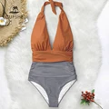 Limited Price CUPSHE Solid And Stripe Halter One-piece Swimsuit Women V neck Backless Monokini 2020 Ladies Beach with Free Shipping Worldwide!